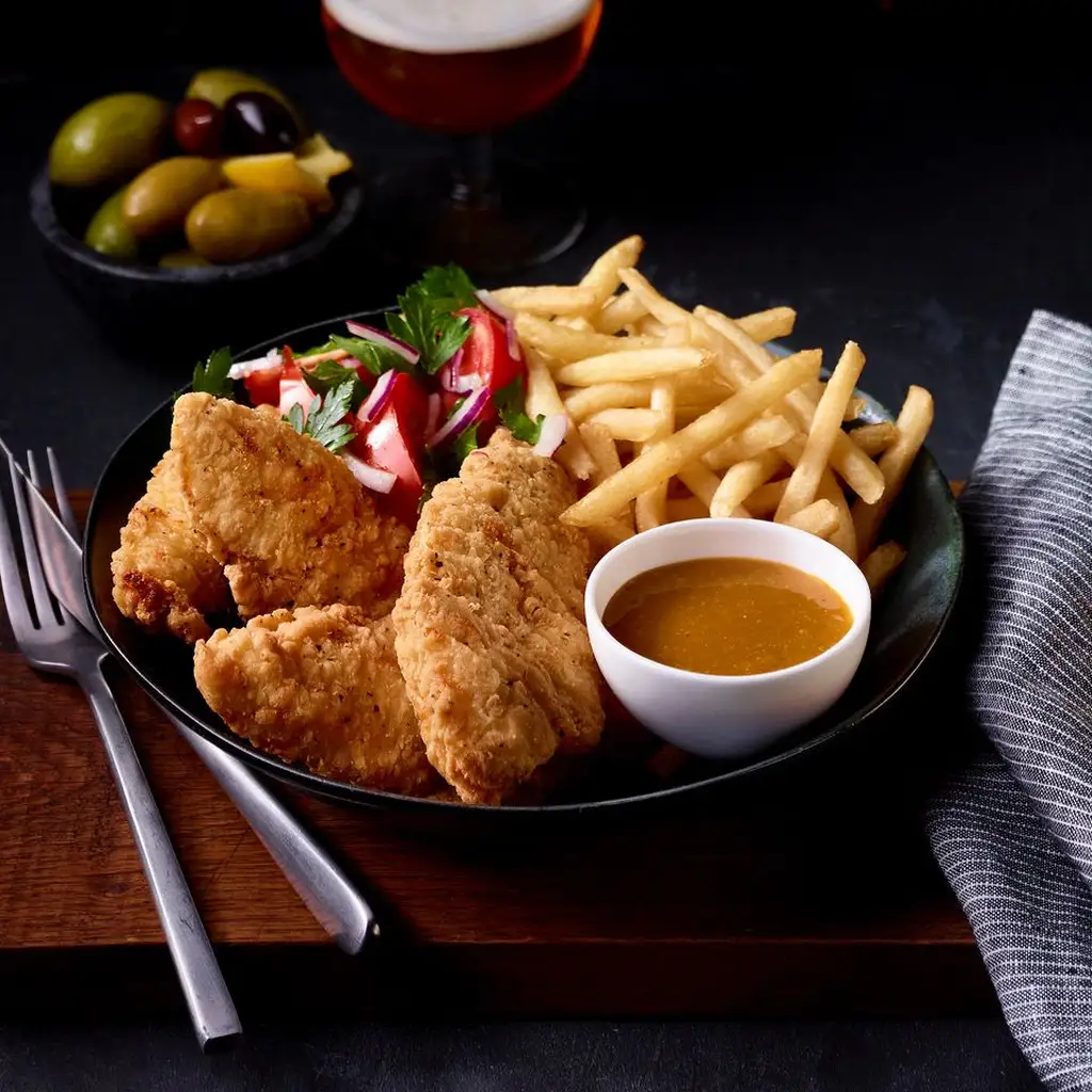 Southern style chicken breast strips, seasoned, breaded, fully cooked